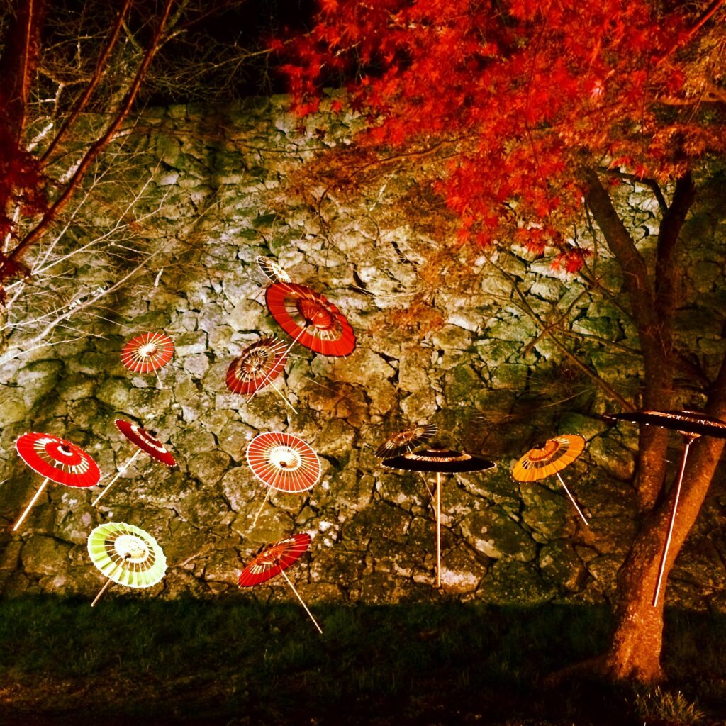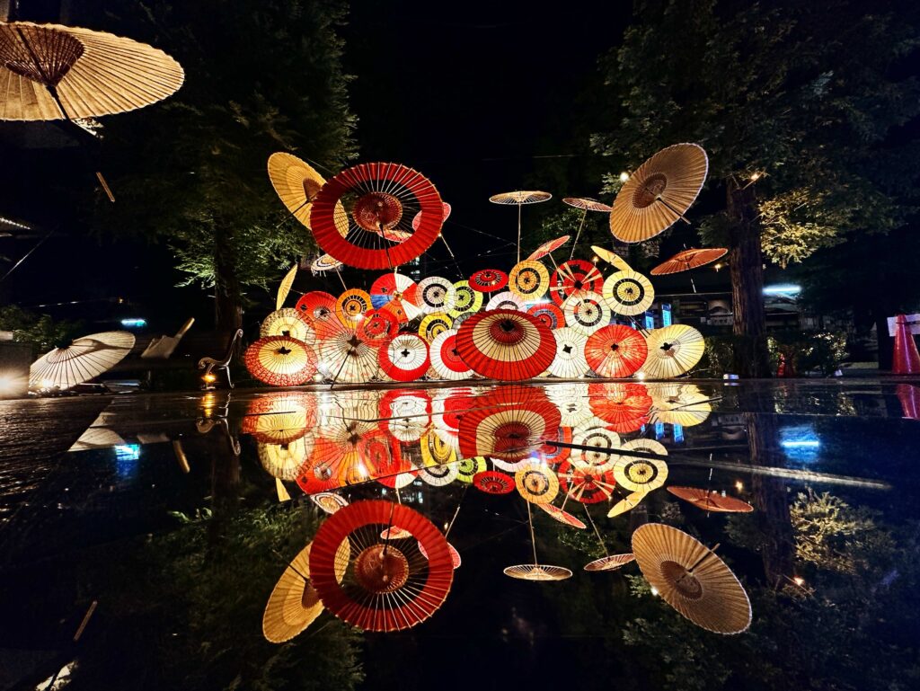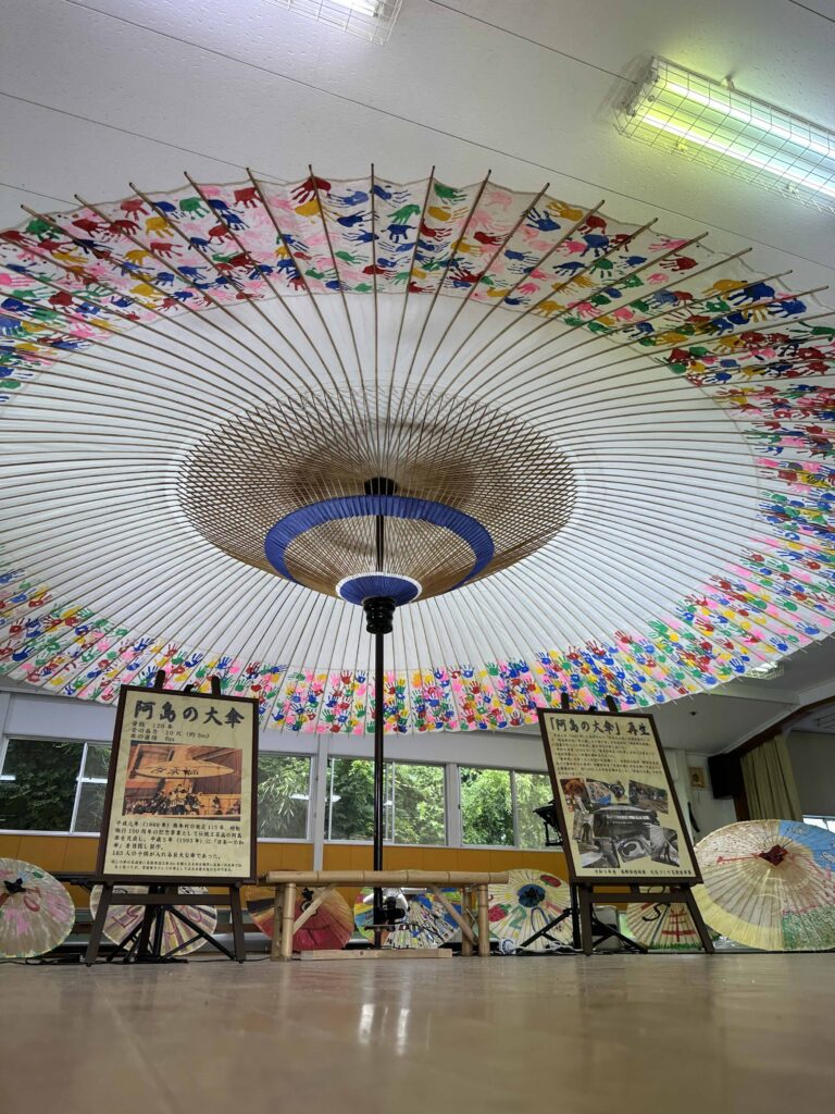 As a member of the Regional Revitalisation Corps in Mima City, Tokushima Prefecture, I conducted Japanese umbrella workshops, compiled reference materials, organised umbrella-making experiences, nurtured successors, curated exhibitions, and authored the regional educational book “What is a Japanese Umbrella? The Mima Chapter”. After my term ended, as a member of the Regional Revitalisation Cooperation Team in Takagi Village, Nagano Prefecture, I was involved in teaching Ashima umbrellas, creating reference materials, restoring Japan’s largest umbrella (6m diameter), organising reference exhibitions, researching Dondo-yaki festivals, and producing the book “What is a Japanese Umbrella? The Ashima Umbrella Edition”. Furthermore, I have consistently continued organising light-up events, Japanese umbrella design exhibitions, and reference exhibitions in various locations since I first became an umbrella maker. Beyond this, I persistently pursue activities to raise awareness of Japanese umbrellas through light-up displays, design exhibitions, and archival shows. For me, if something isn’t known, it might as well not exist. When residing in Kurashiki, I even staged guerrilla performances on my days off, taking a Japanese umbrella into town and asking passers-by, ‘Would you like to hold this?’
