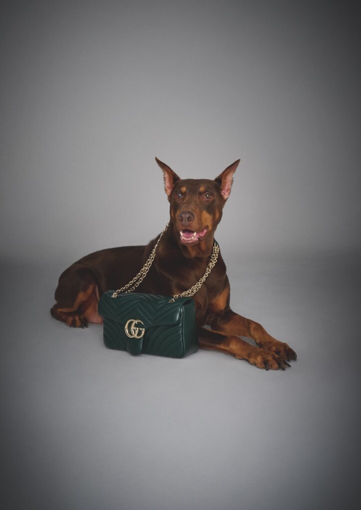 愛情深く、従順、均整の取れた身体を持つドーベルマンにぴったりな印象のショルダーバッグは、グッチを象徴する「GGマーモント」。しなやかなレザーを使った柔らかなボディが特徴的。機能美に優れたプロダクトは、バランスの取れた流線型の身体が美しいこの犬種が寄り添うに相応しいアイテム。