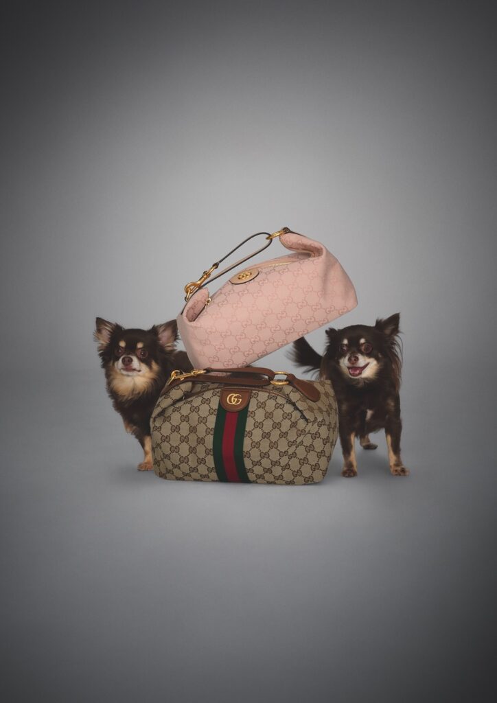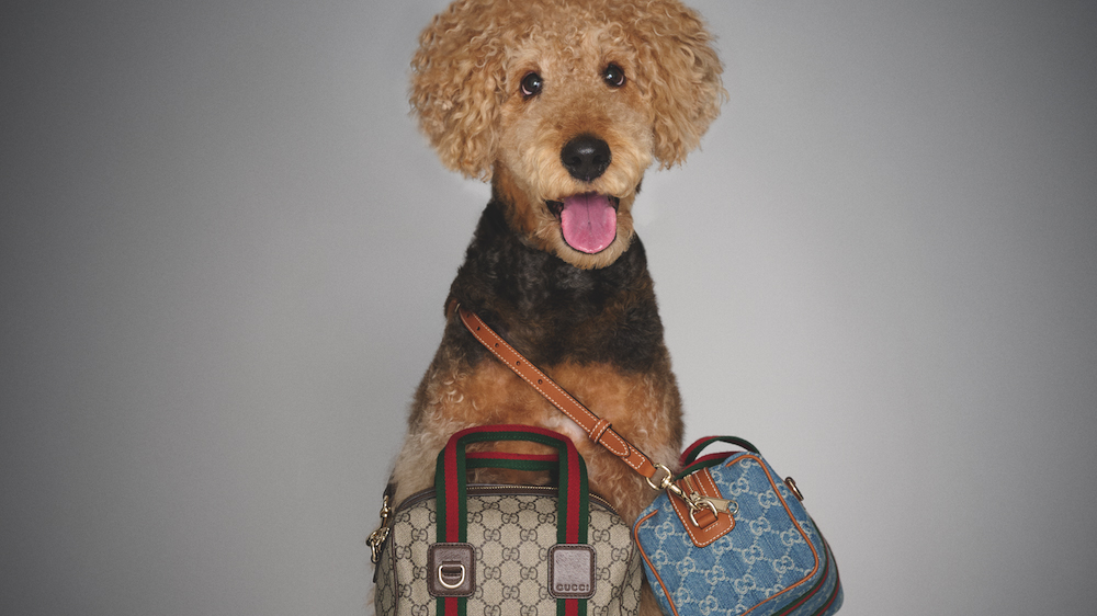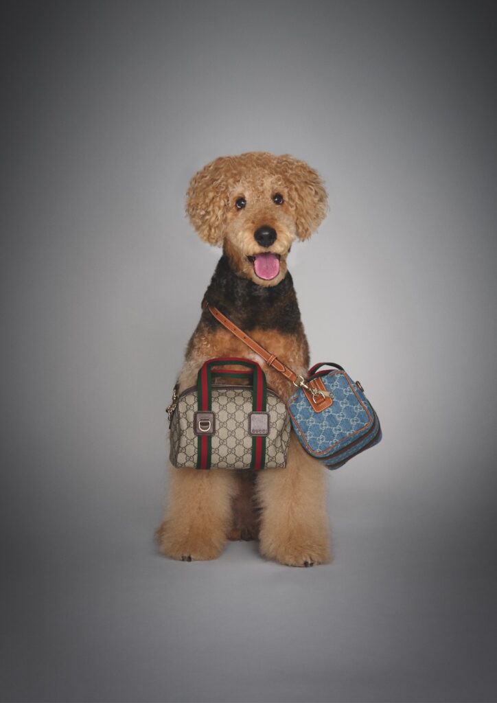 グッチを象徴するウェブ ストライプのハンドルとGGパターンが配されたコーティングキャンパス、そしてもうひとつ、デニムで仕立てたふたつの「Mini GG」ハンドバッグ。愛らしい姿でそれを着こなすのはキング・オブ・テリアといわれ、賢く人なつこい性格で、昔から人々に愛されてきた犬種エアデール・テリア。グッチの歴史へのオマージュを感じるバッグのヒストリーが、この世界に描かれる。