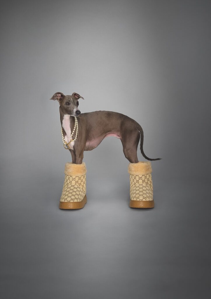 ブランドの伝統を守りつつも、スエード素材仕上げで快適性を追求したレディースブーツ。全体を覆う特徴的なGGパターンは、大胆で現代的なアクセントを加える。パール×ゴールドのハーフホースビット モチーフのネックレスと共に、そのブーツを身につけるのは、高い運動能力とビロードのような被毛を持つイタリアングレーハウンド。そのスマートな佇まいにぴったりだ。