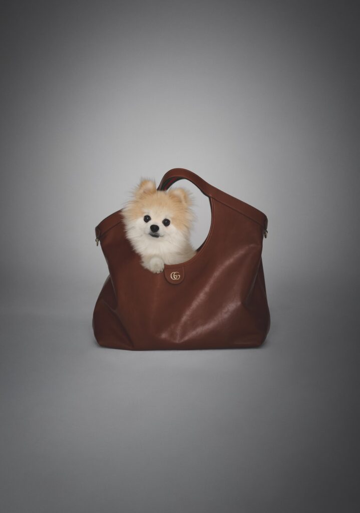 ポメラニアンがひょっこり顔をのぞかせる「グッチ ジリオ」。アイコニックなダブルGを、上質な素材感と豊かな色彩を放つレザーで再解釈。革新と伝統を融合したデザイン、柔らかな光沢レザーが手に馴染む。誰からも愛される代表的犬種のように、どんなファッションにも似合うエレガントなバッグ。