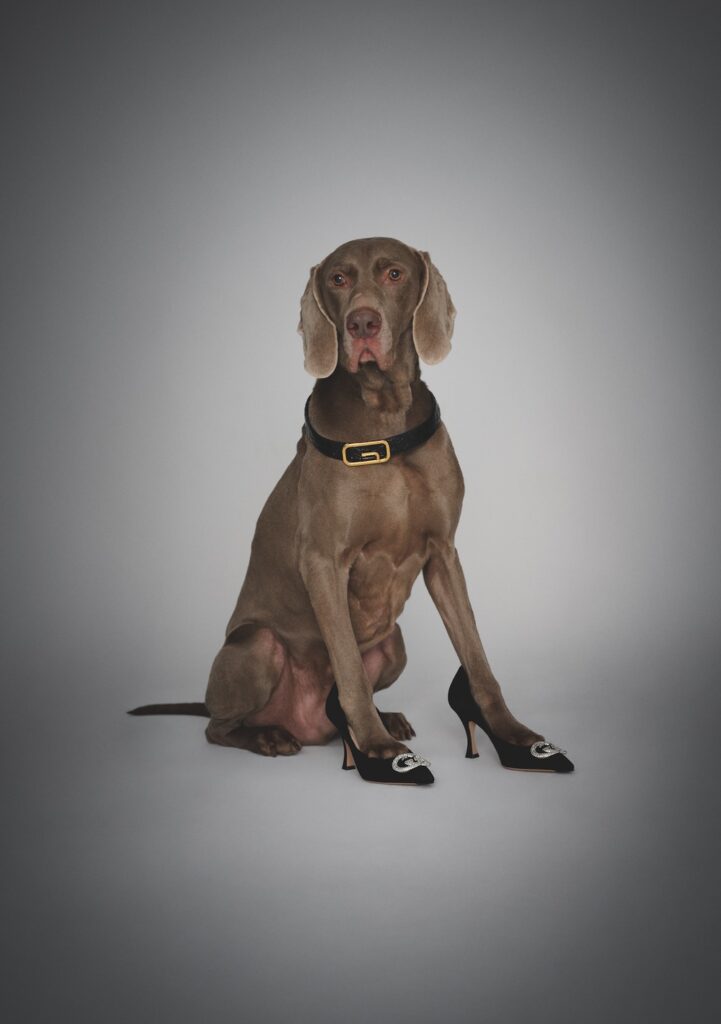 インターロッキングG ハードウェアを飾ったイブニングスタイルのウィメンズ シューズ。クリスタルを散りばめたモチーフがきらめきを添える。その美しいスエードのパンプスを履き、首輪に模した同ブランドのベルトを纏うのは、シルバーの被毛輝くワイマラナー。知的で活発、気品あふれる立ち姿で“グレーゴースト”と呼ばれる狩猟犬のイメージと重なるようなエレガントなプロダクトだ。