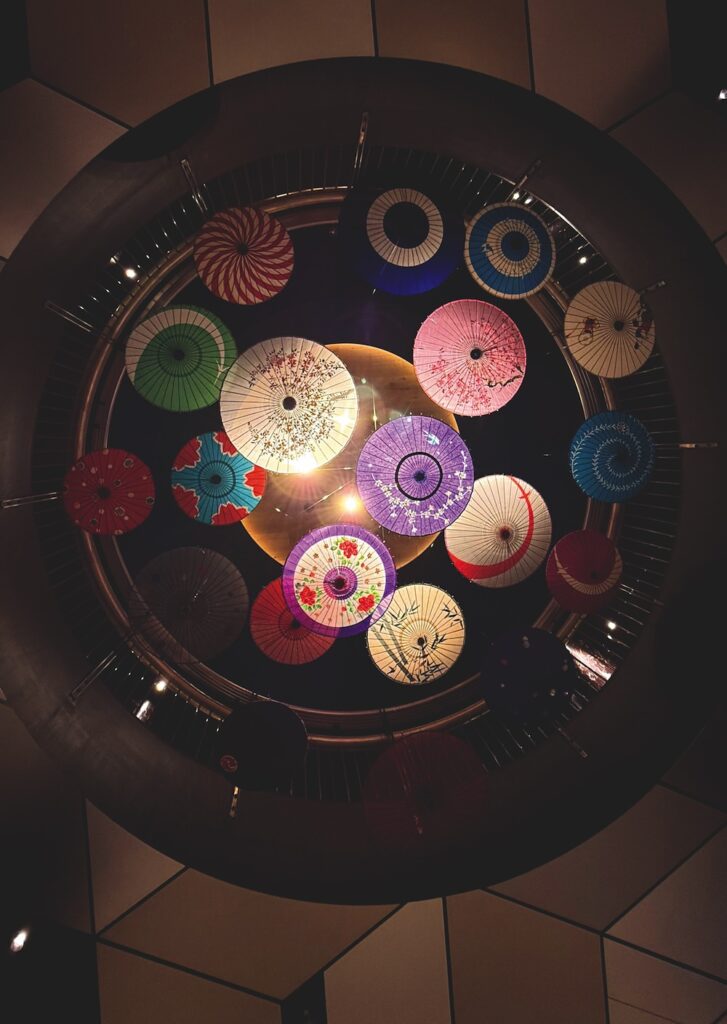 東京・大手町ビルヂング 吹き抜け部 和ルミネーション フローティング和傘は香川県の高松絵日傘を中心として絹かさなどを吊ってます。
