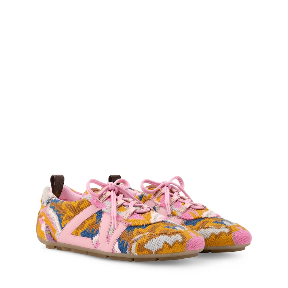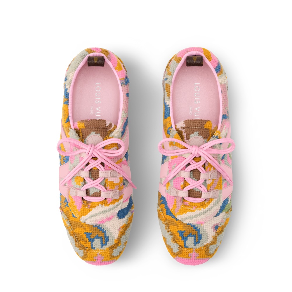 2026春夏ファッションショーに登場した「LV スニーカリーナ」。オリエンタルカーペットと19世紀フランスの刺繍から着想を得たタペストリー素材を使用。ヴィンテージ風のフローラル・パターンがメゾンのモノグラム・フラワーを想起させ、サイドにはレザーで模った「LV」をあしらっている。しなやかなラバーアウトソールも魅力。