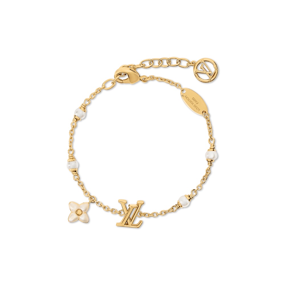 パールの美しさと象徴性を讃え、メゾンの伝統から着想を得た「ブレスレット・LV フローラグラム XS」。ゴールドカラーのメタルを使用し、優美なLV ロゴのチャームと、パールのような光沢感を放つホワイトレジンで彩られたモノグラム・フラワーをあしらっている。4粒の輝くレジンパールが、控えめながらもグラマラスなデザインにフェミニンなエレガンスを添える。