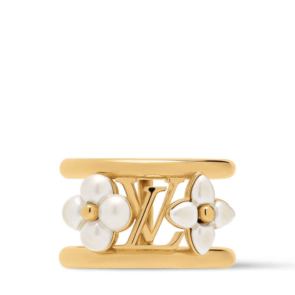 伝統的なモノグラム·シグネチャーと、魅惑的なパールの美しさから着想を得た、エレガントで印象的な「リング・LV フローラグラム XS」。クリエイティブなオープンデザインのゴールドカラーのメタルバンドに、LV ロゴと2種類のモノグラム・フラワーをあしらい、光沢感のあるレジンパールで彩られている。普段使いから特別なシーンまで幅広く活躍する、アイキャッチーでフェミニンなリング。