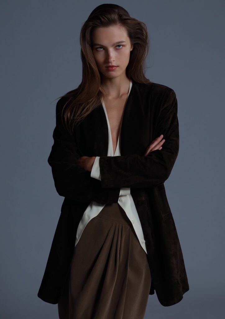 ジャケット、ブラウス、スカートのセットアップ。ジャケットは長めのシングルブレストで深いVネック、ボタンは一つ、ダブルパイピングのポケットと背面中央にスリットが入っている。素材はコーヒーブラウンのスエードナッパレザーで、裏地は光沢のあるダークコーヒーカラーのキュプロ。ブラウスは深いVネックで、前中央にフェイクボタン留めが施されている。前面パネルの縁は丸みを帯びており、肩の縫い目にピンタックが入り、肩のラインは落ち気味のデザイン。素材はバタークリーム色のシルククレープドシーヌ。スカートはショート丈のラップ風で幅広のベルト付き。ベルトからドレープが広がり、裾の両側にダーツが入って袋状のラインを形成している。素材はベージュアーモンドの光沢シルクで、裏地はブラウンのクレープシルク。