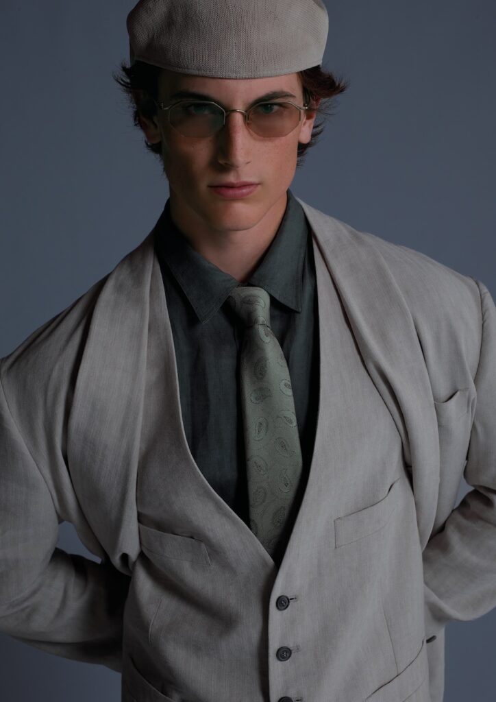 三つ揃いのスーツで、ジャケット、ベスト、パンツで構成されている。グレージュ色のリネン混紡のヘリンボーン柄の織物で作られており、グレーパール色のキュプロの裏地が付いている。ジャケットは構造を簡素化した半裏地で、ショールカラーのダブルブレスト、両玉縁ポケットと 胸ポケットが付いている。ベストはクラシックなデザインで、ポケットと胸ポケット、ウエストを絞るベルトが付いている。パンツはクラシックなワ イドパンツで、ベルトループ、前立て、プリーツが特徴。シャツはくすんだ松の緑色のリネンで作られたクラシックなデザイン。