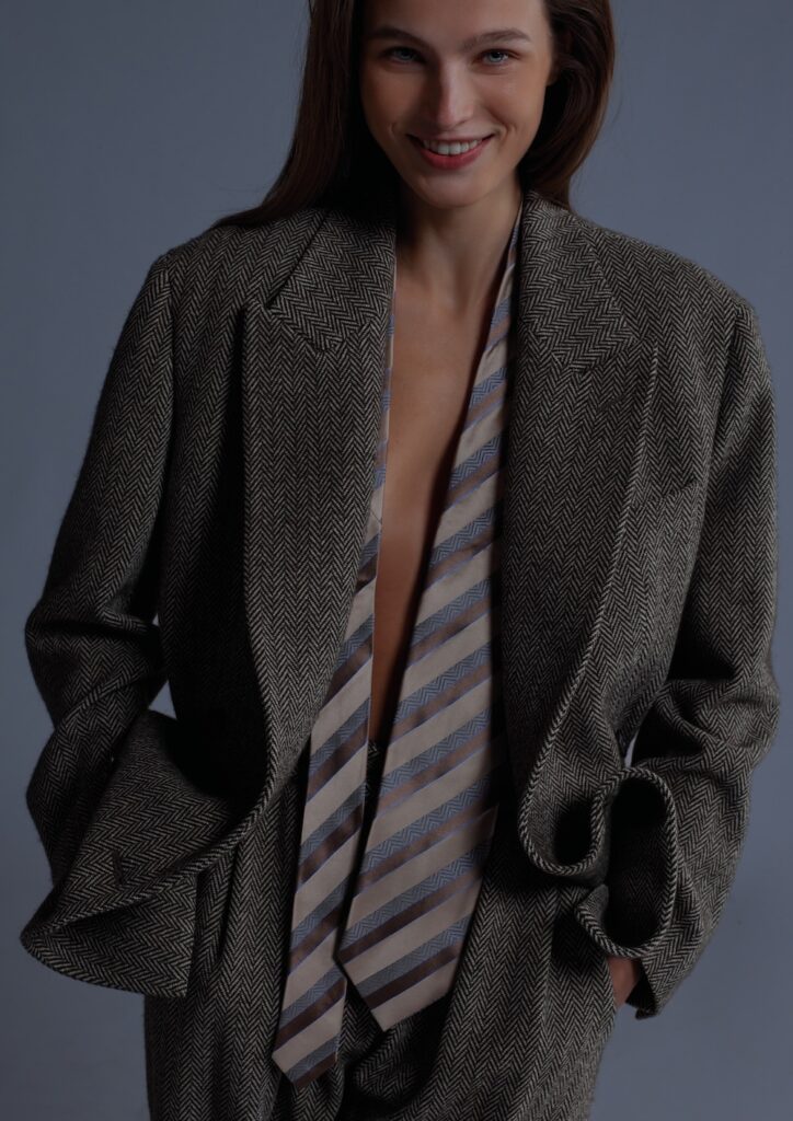 ADV – credit Aldo Fallai 女性向けのコレクションは、ボリュームと構造的なディテールに細心の注意を払ったシルエットに焦点を当てている。セットアップは、肩幅が広く、ワンボタンで留めるジャケットで構成されており、非対称性を生かしていて、しばしば後ろが長く、低めのゴージラインが洗練された少し反骨的な印象を与える。ジャケットの隣にはカーディガンがあり、レイヤリングの可能性を広げる。ウエストにプリーツの入ったワイドパンツや、膝丈のストレートスカート は、清潔感のあるタイムレスなエレガンスを表現。ツイードのバーズアイやプリンス・オブ・ウエールズのチェック柄などの高品質な生地を使用し、クラシックなエレガンスと伝統を現代風に再解釈している。シルクのストライプシャツは、しばしば首に布製のバラの結び目があり、女性らしさを演出し、ジャケットの硬い構造と心地よい対比を成している。アウターは、クロコダイル風の型押しレザーのジャケットやコートを含み、高めでやや絞られた襟が特徴で、個性と大胆さを加えて。カラーパレットは鮮やかで豊かで、エナメルレッド、エメラルドグリーン、ブルー、パープル、ブラック、オレンジ、グレーといった色彩がコレクションにエネル ギーと多様性をもたらしている。フェルトの帽子やハイヒールといったアクセサリーは、洗練された個性を加え、ルックを完成させる。