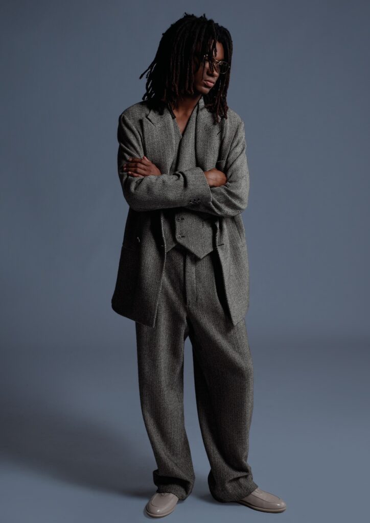 コレクションはリラックス感と洗練さを兼ね備えた仕立てを提案しており、厳格なフォルムが包み込むような素材の使用と流動的でありながら構築的なシルエットの選択によって柔らかくなっている。ピークトラペルのダブルブレストスーツは、1930年代初頭のエレガンスを想起させるが、柔らかく堅苦しさのないサック・スーツの形にアップデート。ジャケットは丈が長くウエストにかけてわずかに絞られ、自然な肩のラインを保ちつつパッドは使われていない。多くの場合、柄物のシャツと同色でコーディネートされ、ネクタイを外してリラックスしながらも洗練された印象を与える。スクエアカットのベストはバスケット編みのセーターと組み合わせられ、滑らかなコーデュロイのパンツと合わせられている。一方、レザーブルゾンはコレクションの都会的な雰囲気を強調。4つボタン、6つボタンのコートは尖ったラペルとシャープなカットが特徴で、トレンチコートは豪華な裏地でリデザインされ、キャメルカラーのコートは細身でややウエストが絞られたシルエットを持つ。ネクタイは使用される場合でも幅が細く抑えられ、控えめで内面的なエレガンスを演出している。素材は密度があり柔らかく触感に優れており、ベルベットやビロードが光沢のある表面に使われ、ラムウールのブークレやクレープはよりボリュームのあるフォルムを作り出す。ブラシドコットン、シェニール、カシミヤ、スエードはデニムの質感を想起させる。コーデュロイはクラシックなテクスチャーとして再登場するが、予想外のニュアンスで表現されている。カラーパレットは濃厚でマットな色合いを中心に、グラファイトグレー、フォレストグリーン、ブロンズの深いトーンが秋の情緒豊かな雰囲気を醸し出している。