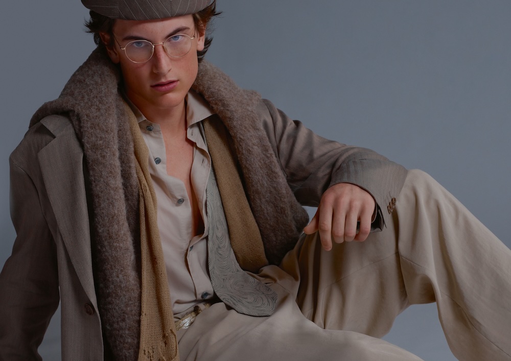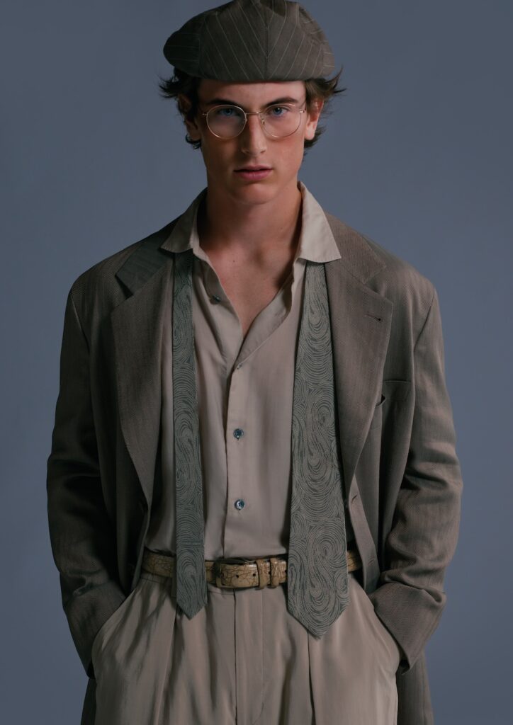 ベージュの砂色とコーヒーブラウンのトーンで、ウールとコットンの混紡のヘリンボーン生地で作られた、ジャケット、ベスト、パンツの3ピーススーツ。裏地はカプリオ素材で、カーキ色のシャンパンカラー。ジャケットは構造を抑えた半裏地で、ダブルブレストのラペルはランス型、ダブルパイピングのポケットと胸ポケット付き。ベストはクラシックなデザインでポケット付き、ウエストは絞りあり。パンツはゆったりしており、ウエストバンド、ベルトループ、前立てとプリーツ付き。シャツはコーリアンカラーで大きな真珠ボタン付き、縦縞模様のビスコースとシルクの混紡生地で、シナモンブラウン、チャコールグレー、アイボリーホワイトの色合い。