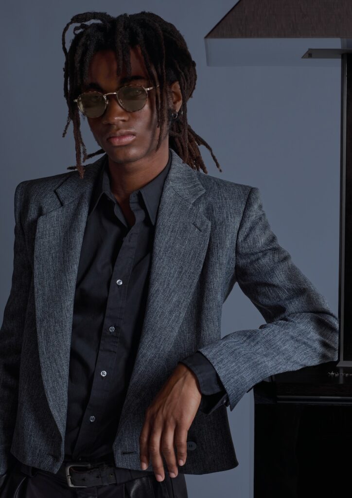 ジャケット、シャツ、パンツからなるセット。ジャケットはクラシックなラペルとラグランスリーブを備えたダブルブレストで、ダブルウェルトポケットとステッチ入りのチェストポケットが付いており、裾は伸縮性のあるゴムで絞られている。素材は柔らかいアンスラサイトカラーのラムレザーで、アンスラサイト色の変化が特徴的なビスコースの裏地が施されている。シャツはミルクとライトミントの色合いのコットンポプリンを用いたクラシックなデザイン。パンツはベルトループやフロントフライ、プリーツを備えた幅広のクラシックスタイルで、ファンゴカラーのリネンとビスコースのシャンタン素材で作られている。さらに、光沢のあるセージグリーンのベースにネイビーブルーのミニドット柄があしらわれたシルクジャカードのネクタイがコーディネートされている。