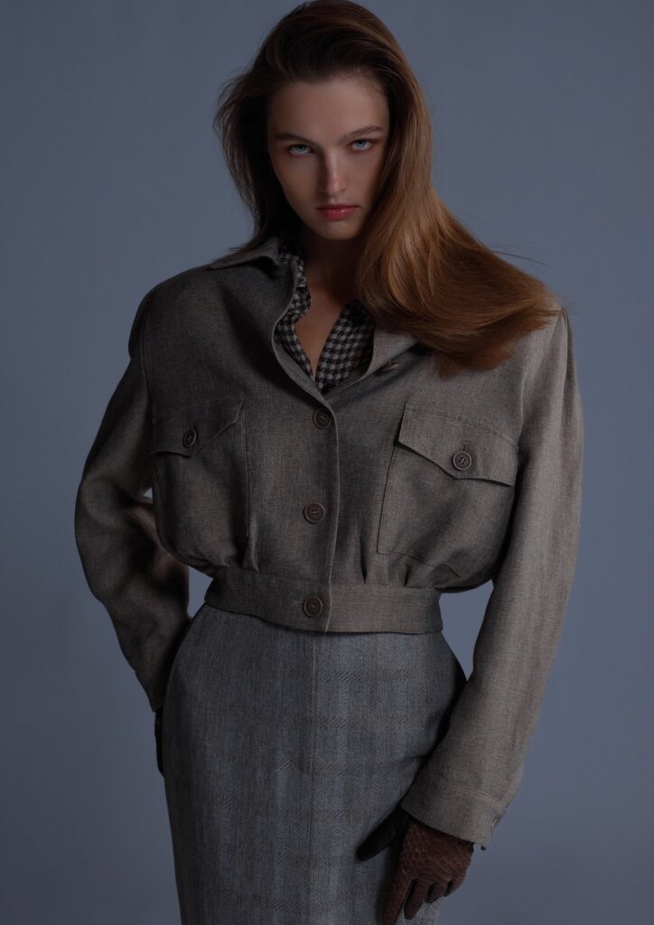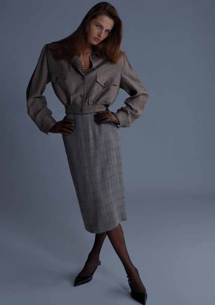 ブルゾン、シャツ、スカートで構成。ブルゾンは短めのシングルブレストで襟付き、パッド入りの肩パッドとフラップ付きポケットが特徴。ブラウン、グレー、ベージュのメランジ調ビスコースギャバジンで作られ、裏地はコーヒーブラウンのシルク。クラシックなシャツはパッド入り肩パッド付きで、コーヒーブラウンとライトサンドベージュのチェック柄プリントシルクシフォンで作られている。スカートはハイウエストのミディ丈で、ペンシルライン、フレンチポケットと前中央にスリットがあり、グレーのトルトラとゴールデンサンドベージュのメランジ調ビスコースチェックで作られている。